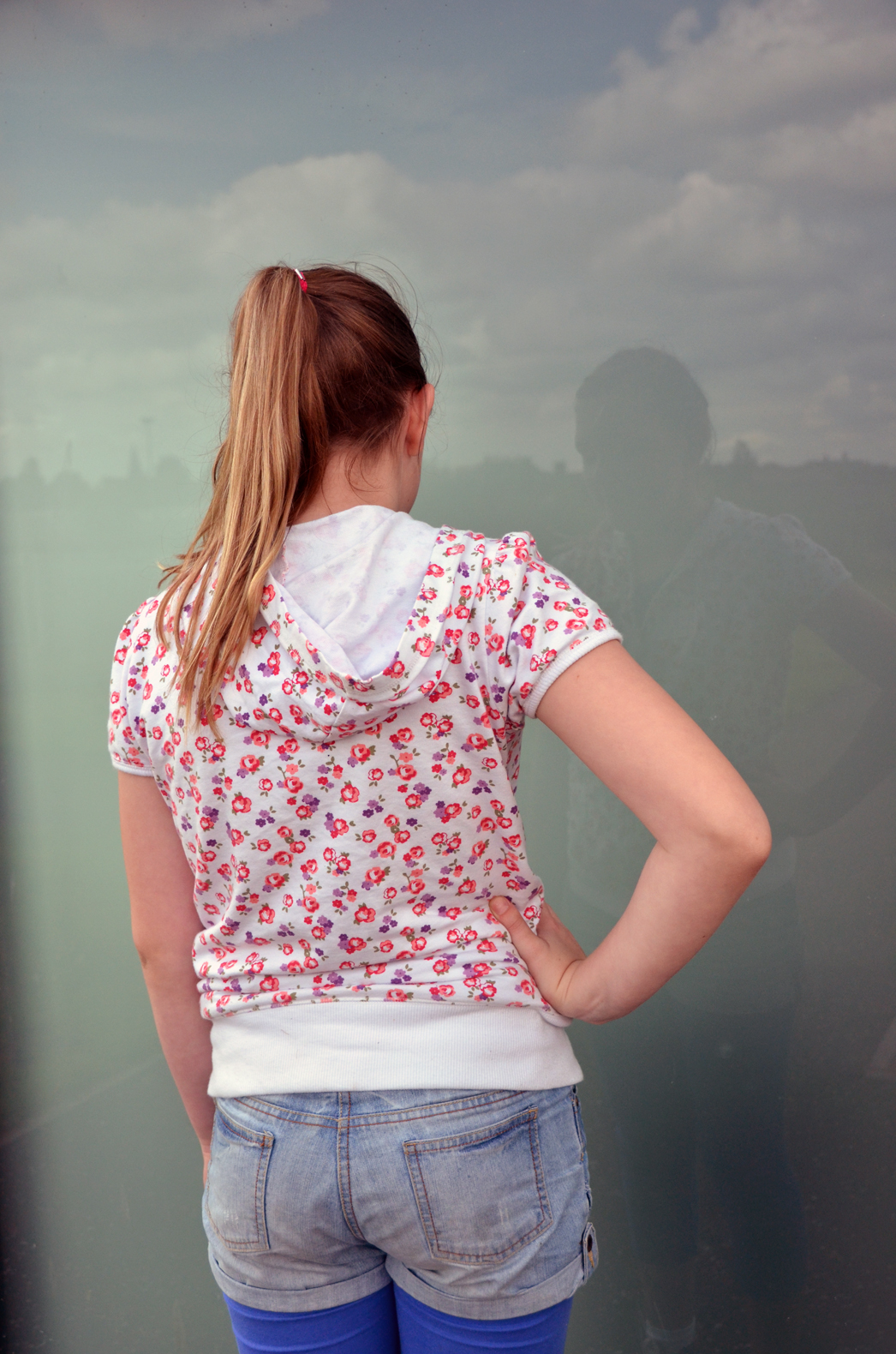 Yesterday I was working through in Falkirk with a group of young people about to start high school. One of the boys was very keen to have his photograph taken. I’ve never been that keen on photographing people facing me smiling and moreover it’s not easy to gain permissions to use images of children and young people within the public sphere. It was a beautiful sunny day and the clouds moved quickly across the sky. The light hitting the glass panels of the building was the perfect backdrop to shoot against- allowing me to isolate subjects. I photographed the first boy, and loved the quality of the image so I did something rather out of character, and asked some of the other young folk if they would like their to have their photograph taken. I am painfully aware of the power I hold in my hand each time I raise my camera to photograph a person and this occasion was no exception.But by using the reflective qualities of the glass I allowed my subjects to be completely in charge of their pose and how they chose to be represented.